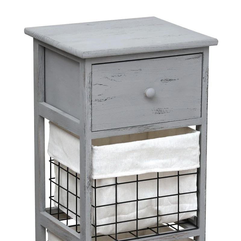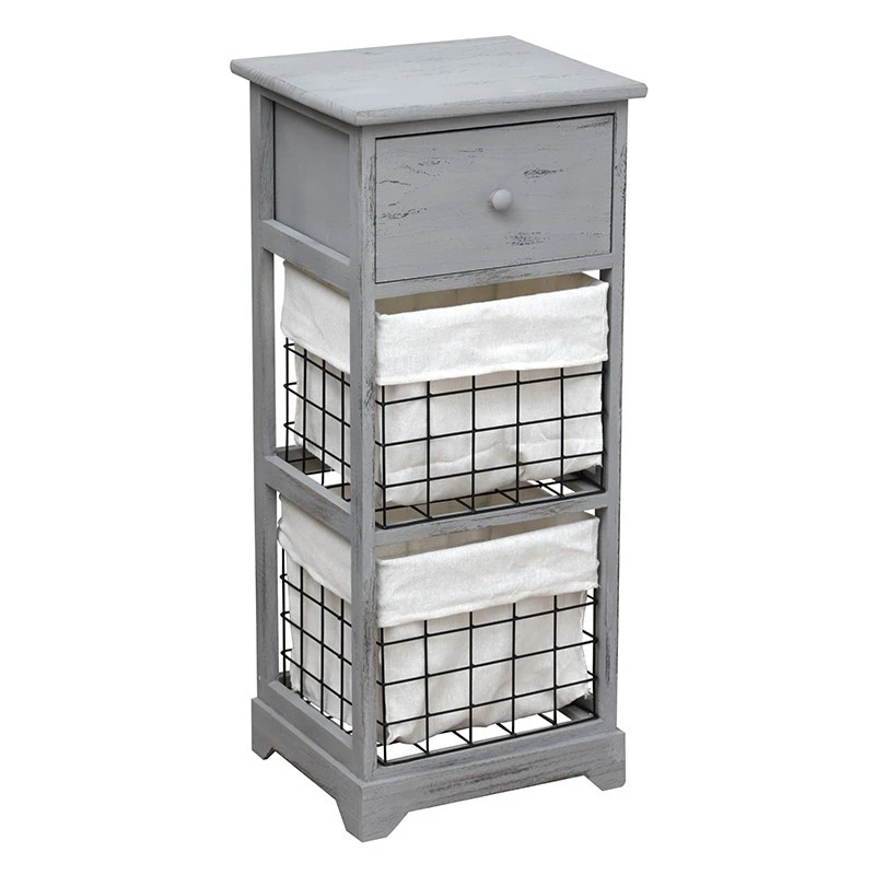 Ce petit meuble en bois est composé de deux paniers en métal avec poche ainsi que d’un tiroir en bois. Idéal dans une salle de bain, dans les WC ou encore comme meuble d’appoint dans une chambre.