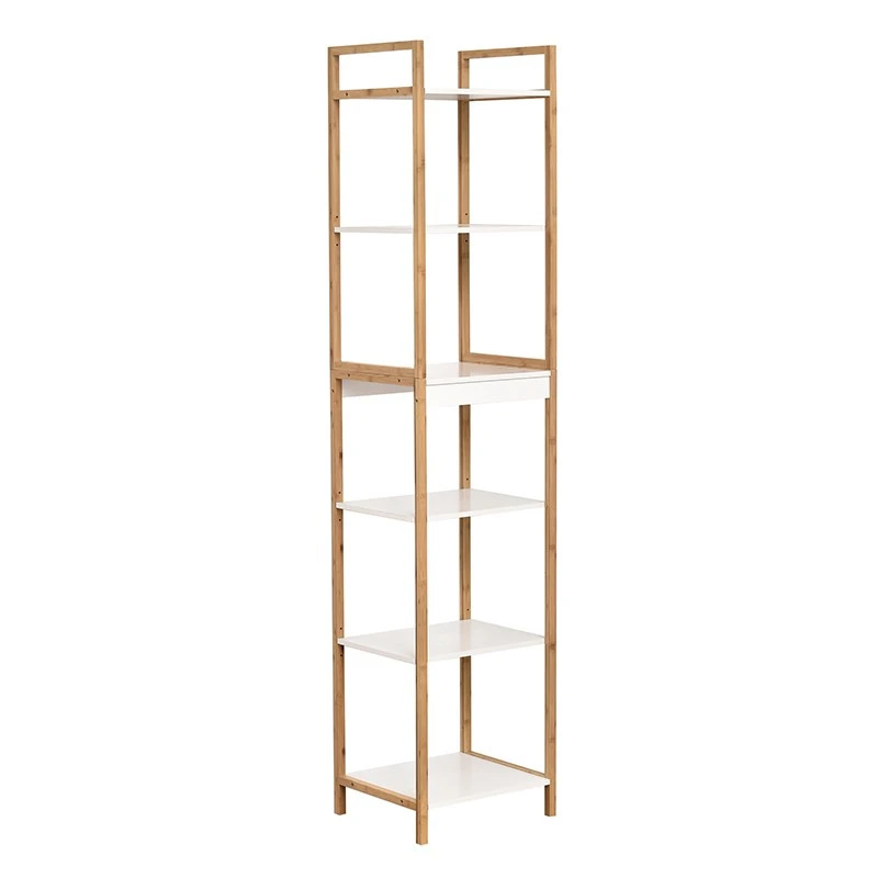 Meuble de salle de bain 6 niveaux structure en bambou. Ce meuble de la collection Nuovo blanc et naturel est conçu pour résister à l’humidité ambiante d’une salle de bain. Idéal pour ranger produits et serviettes de bain…